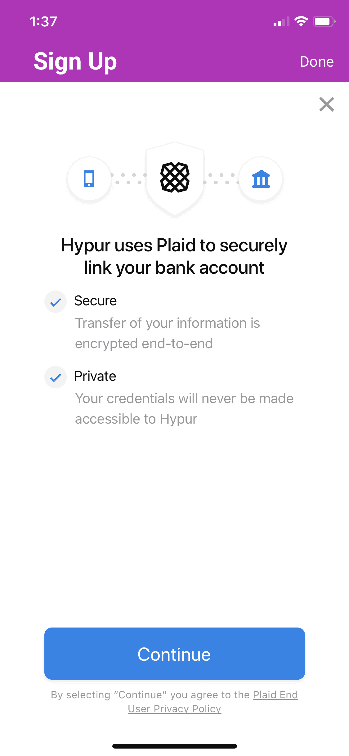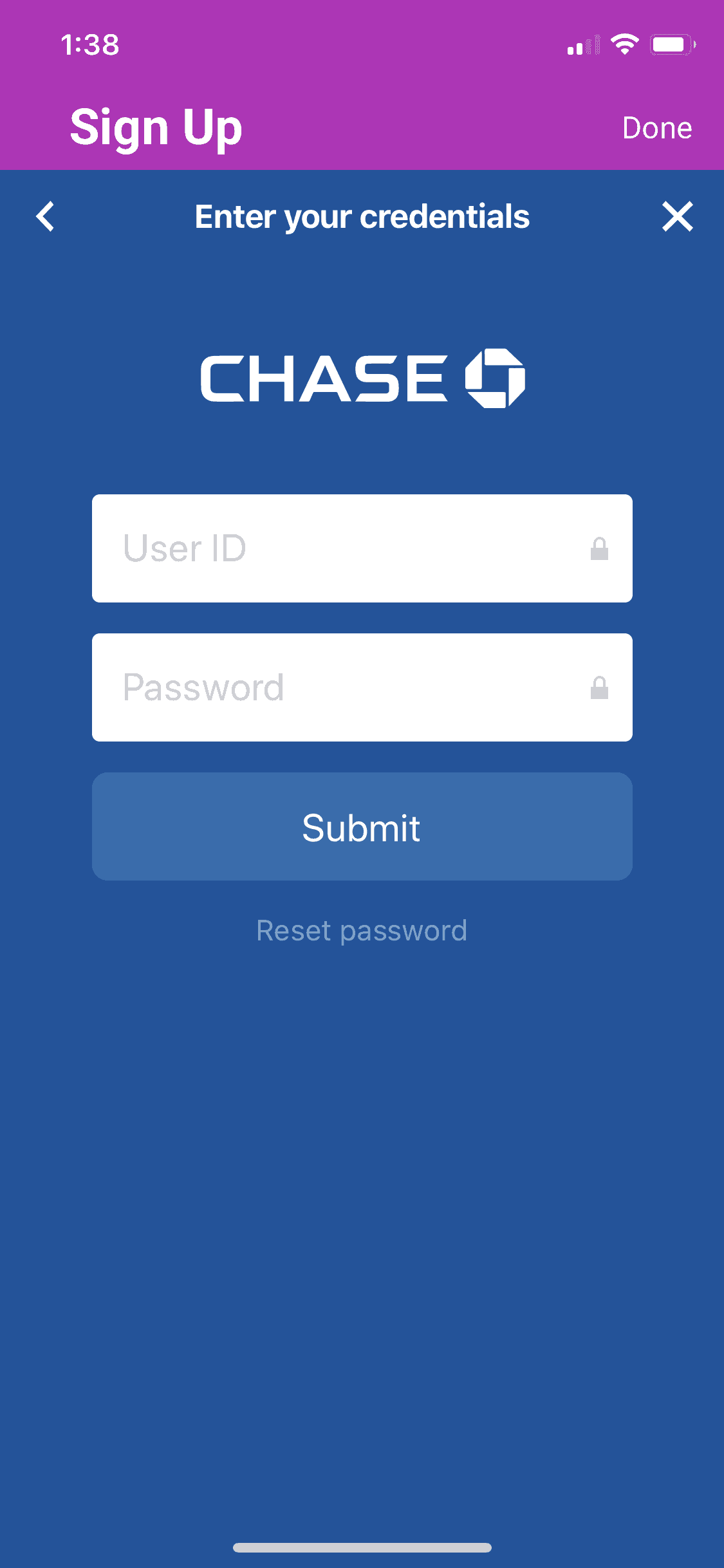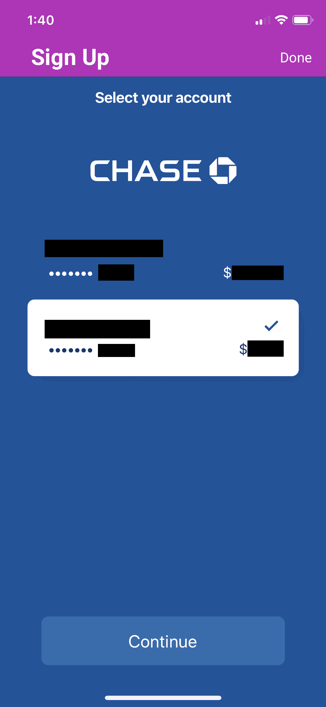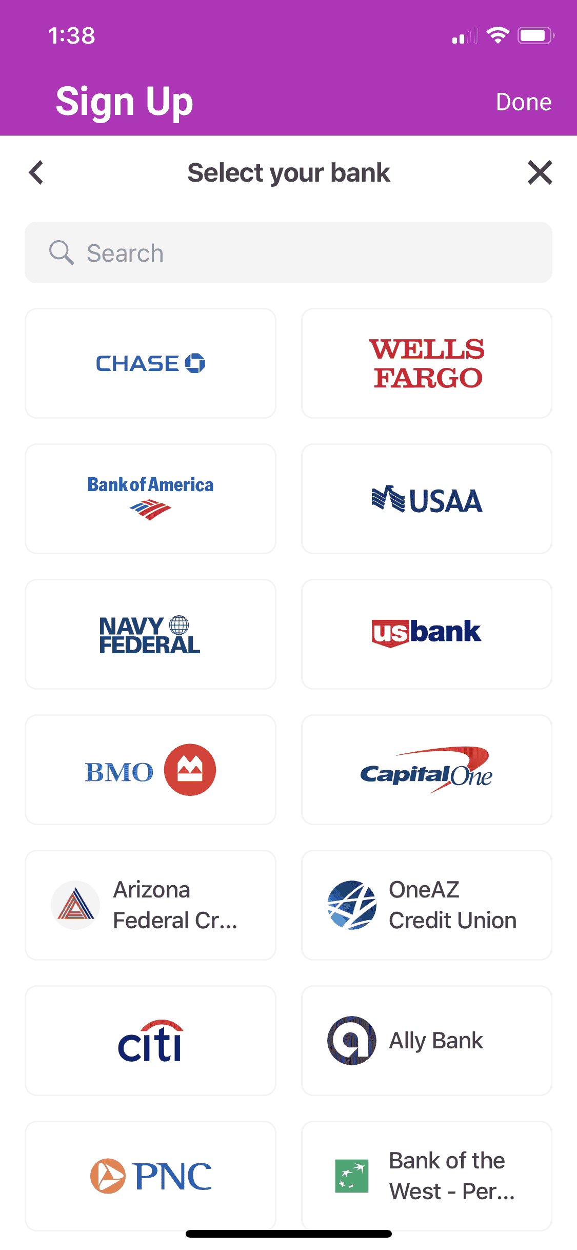 After adding in all of your basic info, the next step will be to link your bank account. This step is about as easy as it gets, all you have to do is tap the logo of your bank from the list and it will pull up a login screen for your bank account.Â